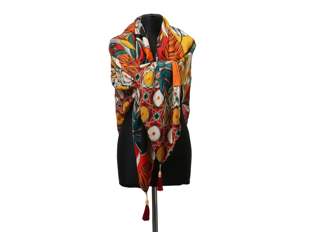 Dámský šátek s výrazným listovým motivem přináší energii barev inspirovaných přírodou. Kombinace oranžových, zelených a zemitých tónů vytváří originální vzor, který zaujme na první pohled a dodá outfitu osobitý charakter.