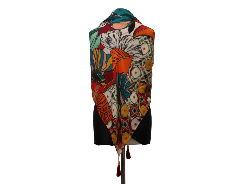 Lehká směs 50 % bavlny a 50 % viskózy zajišťuje hebkost, prodyšnost a pohodlné nošení během celého roku. Díky velkému rozměru 130 × 130 cm lze šátek uvázat mnoha způsoby – kolem krku, přes ramena nebo jako stylový doplněk k šatům, kabátu či jednoduchému outfitu.
