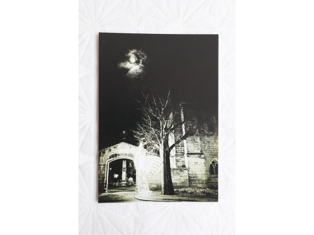 Pohlednice s autorskou fotografií, večerní vánoční čas u kostela, svítící socha anděla a měsíc v oblacích.