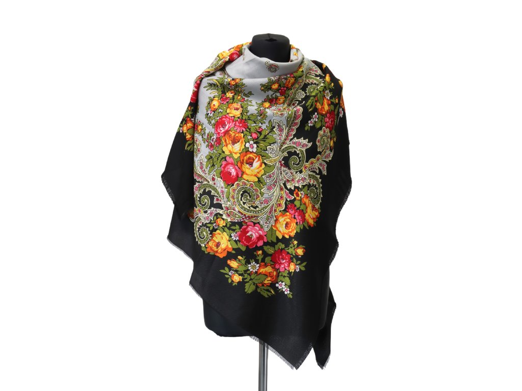Šátek Damašská růže vyniká bohatým květinovým motivem v odstínech červené, růžové, oranžové a zlatavé na elegantním černém podkladu. Ornamentální vzor doplňují jemné paisley motivy, které dodávají šátku výrazný a nadčasový charakter.