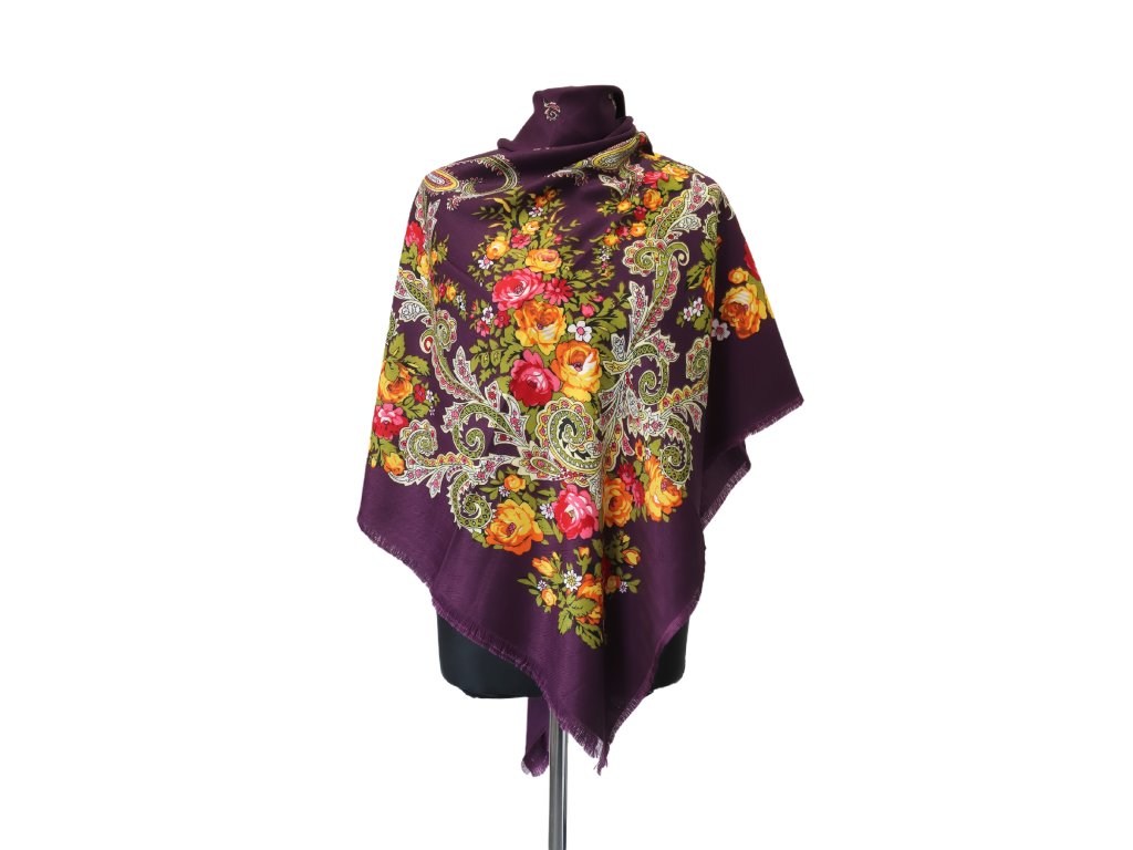 Šátek Damašská růže v elegantním švestkovém odstínu zdobí bohatý květinový motiv v tónech červené, oranžové, růžové a zlatavé. Ornamentální kompozici doplňují jemné paisley motivy, které dodávají šátku nadčasový a dekorativní charakter.
