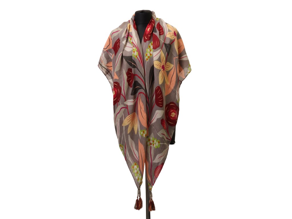 Dodejte svému outfitu šmrnc s tímto elegantním dámským šátkem v jemně šedém odstínu, vínovým a zeleným detailem. Listový motiv v teplých barvách působí přírodně a zároveň stylově, zatímco ozdobné třásně dodávají šátku lehkost a pohyb. Díky univerzálním barvám se snadno kombinuje s kabátem, svetrem i šaty – ideální pro každodenní nošení i slavnostnější příležitosti.